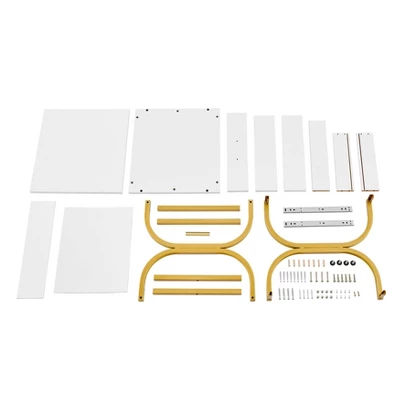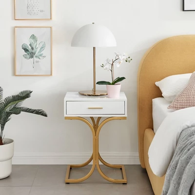 - Contemporary nightstand featuring one white lacquer drawer with contrasting brass gold metal handle and unique curved cutout stand legs