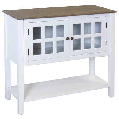 Revitalize the look of your finished basement or living room space with the Two Door Wooden Console with Glass Front. This stylish console cabinet features two doors with glass window pains, allowing for ample storage space. This indoor table also includes a lower shelf, allowing you to stack and store assorted decor pieces. Due to lighting and monitor differences, actual colors and finishes may vary slightly from what appears online.