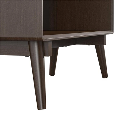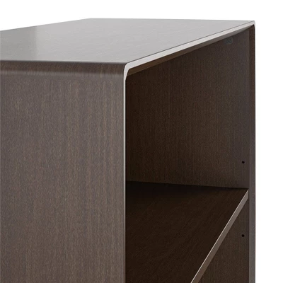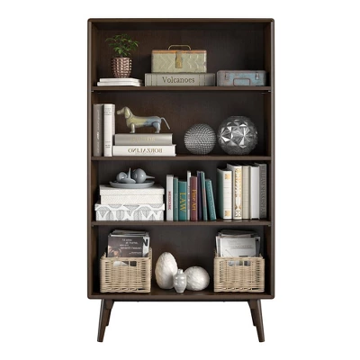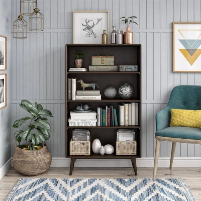 The Novogratz Brittany 4 Shelf Bookcase features open shelves that can each hold up to 25lbs, adding plenty of storage. Made with wood veneer and real wood legs the bookcase has a beatiful walnut finish. A wall anchor kit is included for safety. Ships flat and two adults are recommended to assemble.