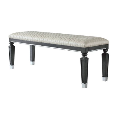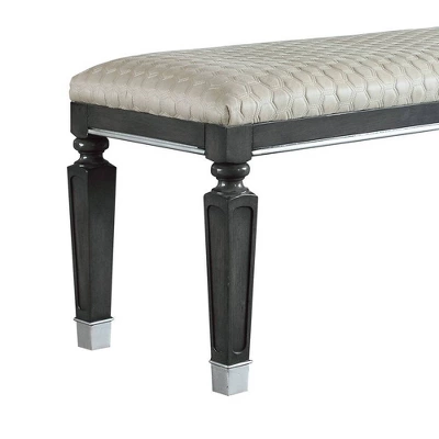 - The beautifully-crafted bench sits atop square taper legs with simple carving décor