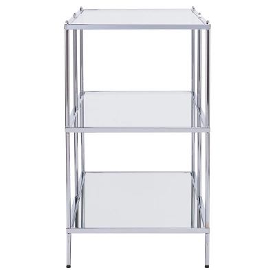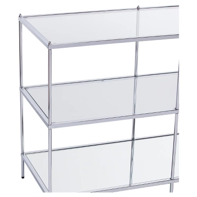Create a stand-out look in your entryway, living room or dining room with this Benton Glam Mirrored Console Table from Aiden Lane. This luxe console table has a three-shelf design that provides ample storage and decor space, and the mirrored tabletops lend a refined air you’ll love. The metal frame has a shiny chrome polish that makes this piece truly stand out, and the visible connecting hardware adds the slightest hint of industrial flavor. Use it to showcase decorative pieces, store fine dinnerware or house your bar collection –– no matter how you style it, you’re sure to love the eye-catching look it adds to your space.