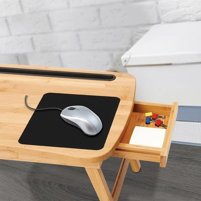 - LAPTOP STAND: tray table accommodates laptop computers up to 17″. Comfortably fits a laptop 15″ or smaller and a computer mouse. Features a padded mouse pad area for added comfort. Integrated storage drawer for storing pens, pencils, stylus, phone, sticky notes, etc. Foldable legs for easy storage