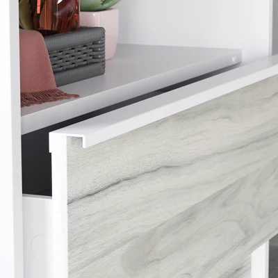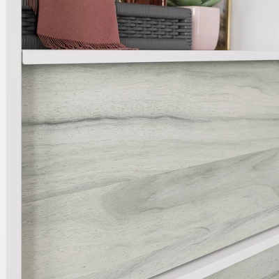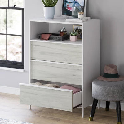 Crisp and clean style and storage in one magnificent piece. Give your bedroom an upgrade while adding stunning good looks with this 3-drawer chest from the Boulevard Café collection. This chest of drawers features three spacious drawers that open and close on smooth metal runners. These large drawers are ideal for stowing away a variety of different items like sweaters, denim, and extra linens. You can find a place for all your things! This 3-drawer dresser features a large open shelf that provides you with additional storage space for easy access of items like your wallet, makeup bag, purse, or home décor. This bedroom dresser includes a roomy top surface for storage and display of an accent lamp, a small mirror, decorative plants, perfume, and more. This white chest of drawers features a durable, powder coated metal frame with a perforated back for an extra touch of detail. Finished in White with Haze Acacia™ accents, this bedroom chest of drawers will have you feeling organized in no time.
