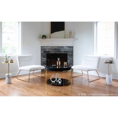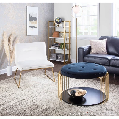The Casper Accent Chair by LumiSource brings comfortable seating in a stylish and slim design to your home. This chair features a padded seat and back upholstered in sleek velvet fabric. Gold metal sleigh legs provide durable support and contribute to the glam style of the chair. Add as seating to your living room, bedroom, or office with this simple yet stylish chair. Available in a variety of upholstery colors, choose the one that fits your space the best.