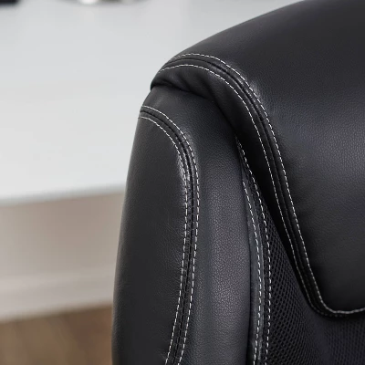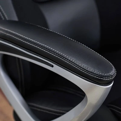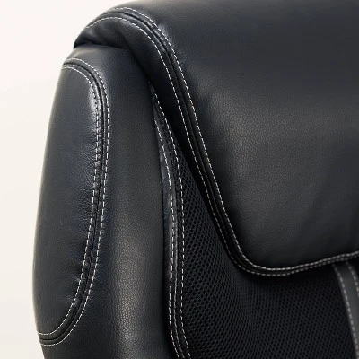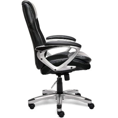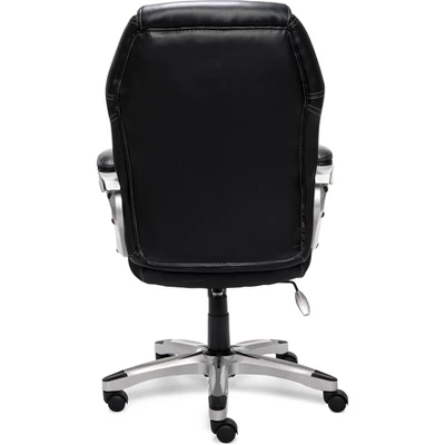For more than 75 years, Serta has been an industry leader in comfort products worldwide. That tradition of innovation and quality continues today. From a brand that is synonymous with quality, comfort and style, the Serta executive office chair is upholstered in soft and durable Smooth Black leather with contrasting seams and stylish mesh accents. This chair features soft pillowed headrest & deep layered body pillows which offer the body a serene and tranquil seating experience. The contoured lumbar provides exceptional support for the lower-back, while the sculpted iridescent silver painted arms have pillow soft pads which provide added hand, wrist, and forearm comfort. The waterfall seat edge is designed to lessen pressure on the back of the legs, and increase circulation, to reduce fatigue and increase working focus. The pneumatic gas lift adjusts the seat height by a simple flick of the lever. Pulling out the same handle will unlock the recline mechanism and allow you to lean back in comfort. The recline resistance can be adjusted with a turn of the tension knob on the bottom of the seat. Smooth rolling multi-surface dual wheel casters provide easy access to your surrounding work area. The heavy duty five-star base meets or exceeds rigorous BIFMA testing standards up to a 250lbs weight capacity. Measures 25.75” wide by 28″ deep by 42.25″-46″ high. It is delivered in 1 box measuring 28.25″ long by 14.75″ wide by 26″ high. 1 year limited warranty. Product assembly is required. Designed in the USA. Manufacturer style number is 43673