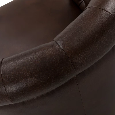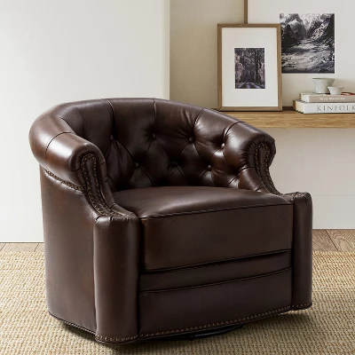 - CHESTERFIELD STYLE: The swivel chair features a Chesterfield style with a tufted back, recessed and rolled arms, and nailhead trim along the arm and base. These design elements combine to create a sophisticated and timeless look.