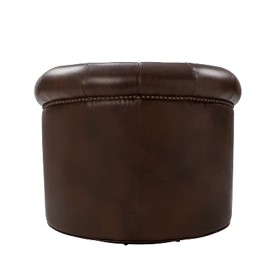The swivel chair is a luxurious piece of furniture that exudes elegance and style. Crafted with the utmost attention to detail, it features a seat upholstered in genuine leather, ensuring both durability and a sophisticated aesthetic. The tufted back, reminiscent of the classic Chesterfield design, adds a touch of vintage charm and timeless appeal. With recessed and rolled arms, this chair offers both comfort and a regal appearance. The nailhead trim along the armrests and base enhances its opulence, providing a refined and polished look. To further enhance its functionality, the chair boasts a 360° swivel feature, allowing for effortless movement and convenience. This swivel chair effortlessly combines luxury, comfort, and versatility, making it the perfect addition to any stylish living space.