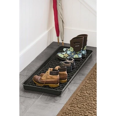 - BENEFITS — Boot Trays are a must-have in rainy season, mud season, snow season! Made of rugged, recycled plastic, they have an extra-deep rim to corral melting snow and mud. This large tray holds a whole family’s worth of shoes and boots in your entryway or mudroom. The Rubber Grids (included) elevate boots and shoes to help them dry more quickly.