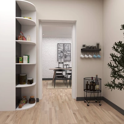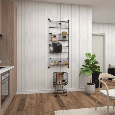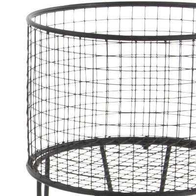 - •A black metal storage cart featuring a round grid style storage, open-designed base, and caster wheels