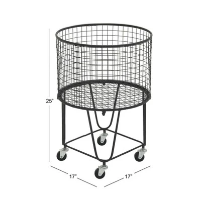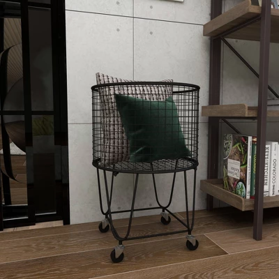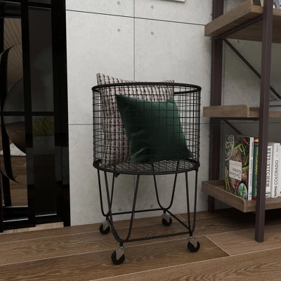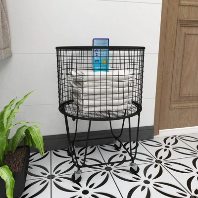 - •Rolling laundry basket with a wide metal mesh body and black finish