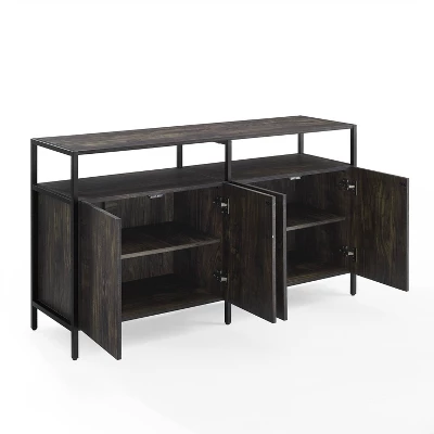 Bring a modern edge to home entertainment with the Jacobsen Media Stand. Combining sturdy steel with the look of rich wood, this stand has a streamlined industrial look. Sure to be the focal point of your living space, this media stand will hold a television or display your favorite turntables. Beneath the tabletop is an open shelf for storage and display, plus two large cabinets ideal for housing your favorite vinyl, books, or board games. Stay organized in style with the Jacobsen Media Stand.