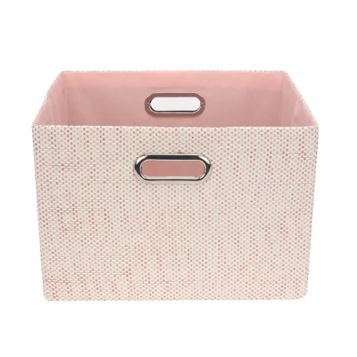 This sturdy storage basket is the perfect addition to your child’s nursery or playroom. It is made of pink and white cross weaved straws and has a pretty pink polyester lining inside. There are two silver handles on the sides for carrying. It easily folds up for compact storage when not being used. It is sized at approximately 12 1/2” X 11” X 9”. Spot clean only