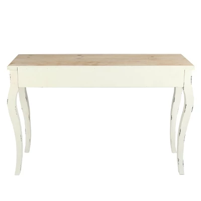 Ideal for small spaces, hallways, and entryways, this Victorian-style console table has a decorative front apron and flat back side, allowing it to sit flush against a wall or furniture. Whether you use it as a console table, sofa table, or entryway, this curvy-legged table is an excellent option to complement various styles. The console table has a beautiful wood top with a natural wood finish. The top is the perfect place for your stylish lamp, vases, or family pictures. The wood table top is supported by gracefully curved legs in a distressed off-white finish that adds to the beauty and charm of the antique look of the table. In addition, the wood console table has a warm appeal that will make your guests feel instantly at home.