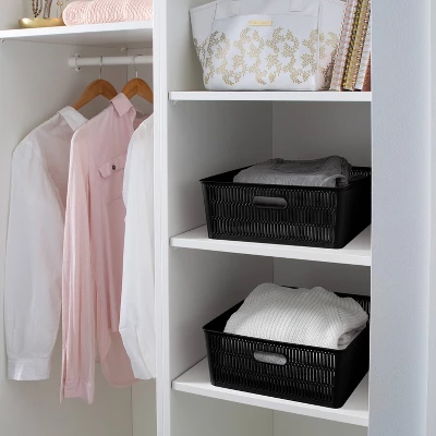 Maximize your storage space with the Simplify 2 Pack Slide 2 Stack It Shallow Storage Tote Baskets. Created with a patented slide to stack design which provides slide out corner support that allow the totes to be safely stackable. storage totes hold up to 25lbs while stacked, allowing you to maximize your storage in closets, cabinets, shelves and more. The totes neatly nest inside when not in use. Organizing just became easier with the Simplify slide 2 stack it totes!