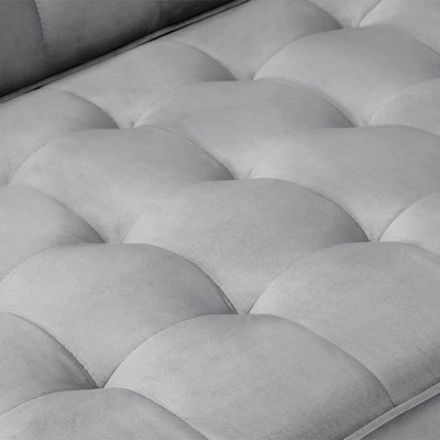 The Armen Living Somerset Velvet Mid Century Modern Sofa adds a touch of luxury to any home. Designed for elegant, comfortable living, this contemporary tufted sofa is a classic. Its generous proportions are upholstered in sumptuous velvet with luxurious tufted detail. The gold-finished caps on its tapered wooden legs add fun retro flair. The Armen Living Somerset Velvet Mid Century Modern Collection features a club chair, loveseat and sectional sofa. This Velvet sofa is available in your choice of Blush or gray velvet upholstery.