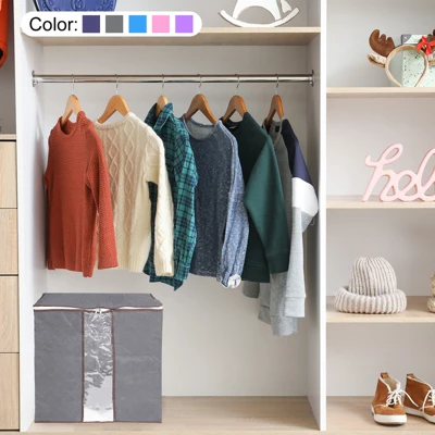 Why Choose Clothes Storage Bags Large Capacity Clothes Storage Bins Foldable Closet Organizers?Made of three-ply material, sturdy and durable, and odorless, protect your clothes from dust and moisture.The fabric is gentle on your clothes, Comforters, and blankets.A see-through window in the front allows you to quickly see what is stored inside the totes for storage.Lightweight, portable, and foldable storage bags allow them to be easily stored to save space when not in use.It is spacious for your quilts, blankets, pillows, jackets, or others. Portable & Zipper Closure – Two-way zippers allow it to easily slide along the closure when in use, regardless of how full the bag is. A two-way zipper allows it to easily slide along the closure when in use, preventing dust from entering, and keeping your clothes neat and tidy.Reinforced Handle – We used reinforced handles to double the load-bearing capacity of this storage bag.Two side handles to make it convenient to be carried from one place to another. The reinforced handle with two layers of thick fabric to prevent tearing.The handle seams for added strength for easy portability and transport.A clothing storage bag is suitable for storing your Comforters, blankets, jackets, or other clothes for changing seasons.In addition, the collapsible design makes it easy to store when not in use.Package included 6 pcs.Please allow a 1-3cm deviation due to manual measurement.Actual color may be slightly different from the image due to different monitor and light effect.