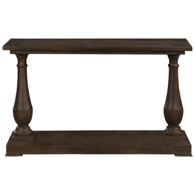 Perfect for a living room or entryway foyer, this transitional sofa table lends a charming traditional flair. A rich coffee brown finish offers a refined look to the tropical wood construction, creating a bold look against a focal wall. This sofa table also offers a spacious and long tabletop and open bottom shelf for resting accent lamps, baskets of throws and more. Connecting the plank style surfaces are column-like turned pedestal legs that offer a classical element. A tall and open space above the bottom shelf invites one to store taller decorative items too.