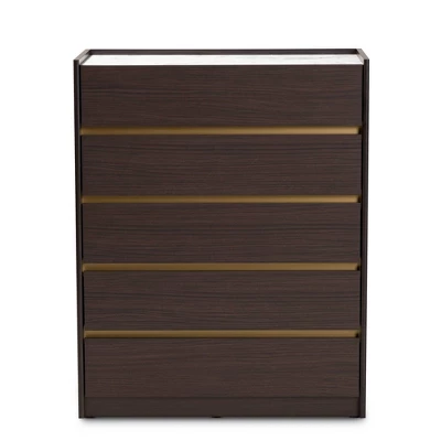 The sleek, modern flair of the Walker chest organizes your space in stunning style. Made in Malaysia, the Walker radiates rich wood tones with its dark brown finished frame. Five spacious drawers, outlined in a striking gold-tone finish, help maintain busy rooms with ample storage space for clothes, linens, and more. Requiring assembly, the Walker features a faux marble top for a luxurious accent steeped in modern glamour. With its radiant design and flexible convenience, the Walker chest is a superb addition to any space. Dimensions: 39.4″ High x 31.5″ Wide x 15.75″ Deep; Drawer Dimensions: 2.9″ High x 28.1″ Wide x 12.25″ Deep;