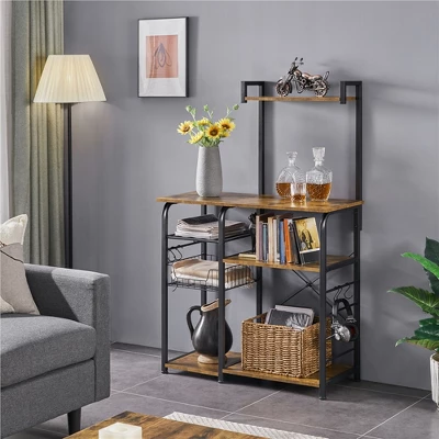 • Add a rustic farmhouse/industrial look to your open concept kitchen. This utility storage shelf offers a long shelf for microwaves, coffee makers, and other smaller appliances, while three lower shelves house dishware, snacks, or other kitchen needs. A wine rack is an ideal place for your tasty wine. The top shelf and metal wire tray help organize your often-used spice bottles. 10 hooks are provided to hang potholders, mugs, dishcloths dry and clean. Just extend your kitchen storage with this multiple-shelf baker’s racks, ideal as a sideboard or bistro shelf.